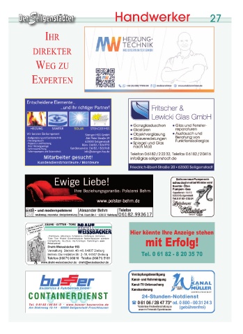 Handwerker 27 IHR DIREKTER WEG ZU EXPERTEN jáí~êÄÉáíÉê=ÖÉëìÅÜí>= hìåÇÉåÇáÉåëíãçåíÉìêÉ=L=jçåíÉìêÉ Hier könnte Ihre Anzeige stehen mit Erfolg! Tel. 0 61 82 - 8 20 35 70